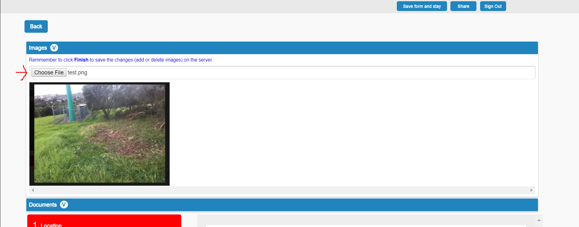 Note 1: Only mobile device can use camera. Image will appear after selected an image or take photo. Finally go to the end of the form and click “Finish”.